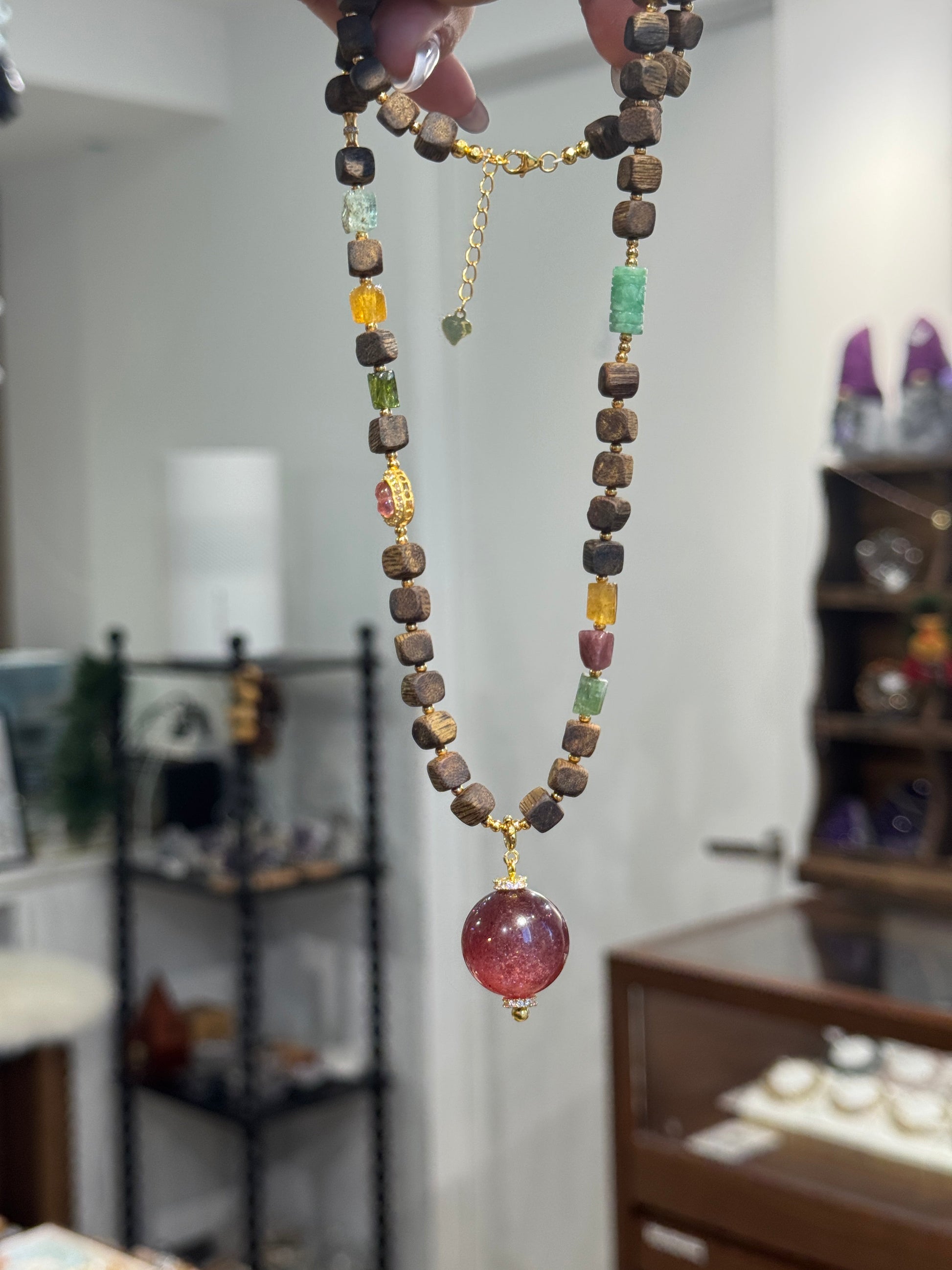 沉香自古被视为"香中之王",有助于静心安神,提升灵性觉知;翡翠象征平安吉祥,碧玺带来快乐能量,草莓晶则寓意爱情与人际和谐。这条项链集多种宝石能量于一身,既能作为冥想修行的辅助,又能在日常佩戴中展现你的独特品味。无论是搭配旗袍、禅服,还是现代简约风格,都能完美融合,展现出东方女性的温婉优雅与内在智慧。